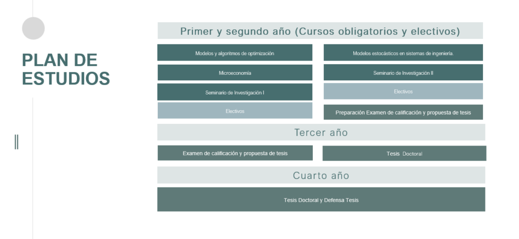 A continuación se incluye la lista de cursos electivos para el Doctorado en Sistemas de Ingeniería que se han impartido en los últimos semestres. La lista se actualiza cada semestre. Los estudiantes pueden solicitar la incorporación de cursos a esta lista al Comité Académico del Programa.
